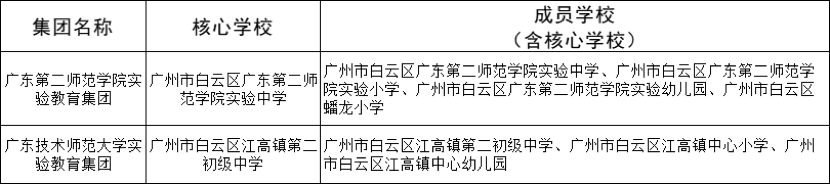 2个高校教育集团:广东第二师范学院实验教育集团、广东技术师范大学实验教育集团。该类教育集团由高校托管,成员校有多学段一贯的特点,旨在推进高校资源品牌、管理师资等优势辐射到基础教育。