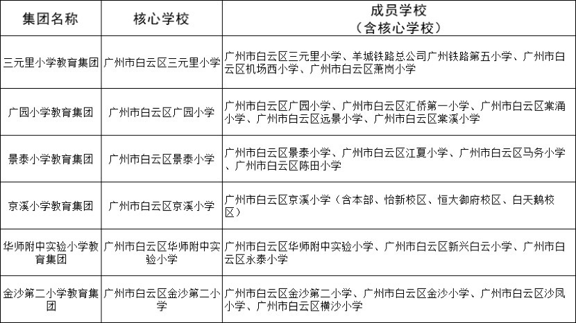 6个小学教育集团:三元里小学教育集团、广园小学教育集团、景泰小学教育集团、京溪小学教育集团、华师附中实验小学教育集团、金沙第二小学教育集团,该类教育集团以原省一级学校等小学名校为核心校,成员校均为小学。