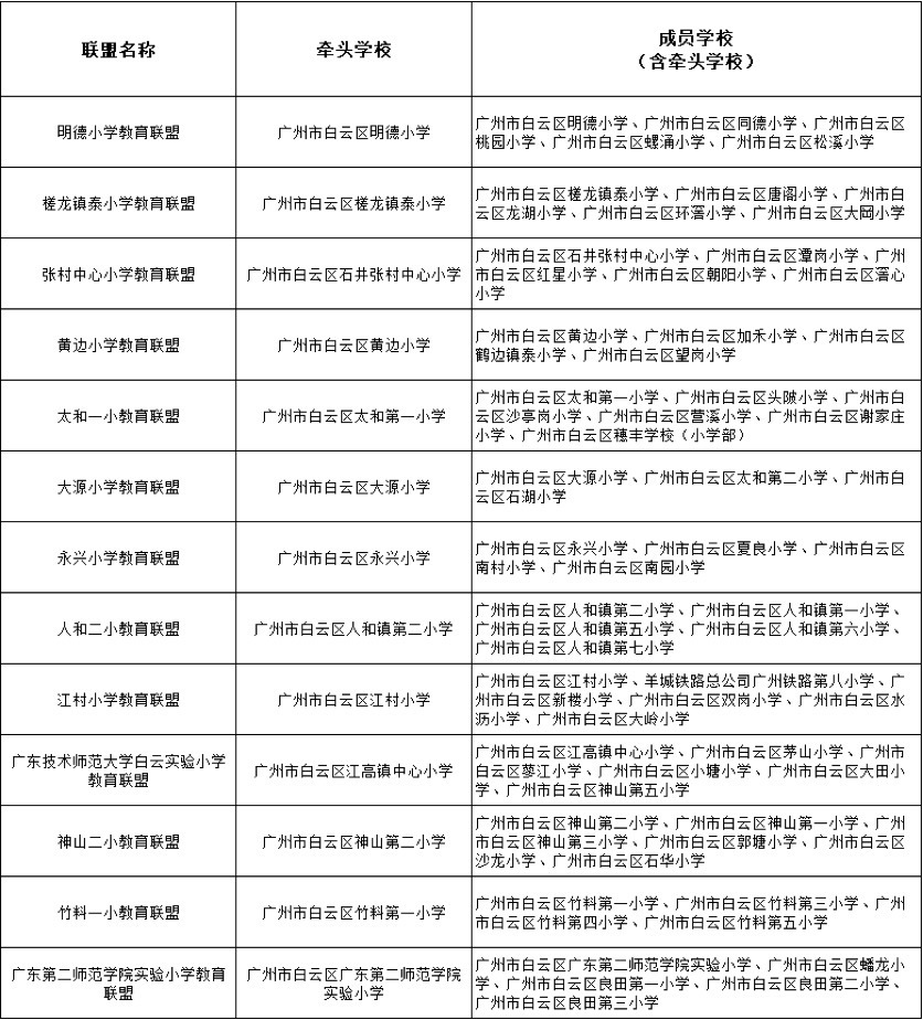 白云区教育联盟按照相对就近、强弱结合、抱团发展的原则,白云区以优质小学为牵头校,横向纳入区内若干小学,以“1+N”的模式组建同学段、同学区、相对松散型学校共同体。教育联盟以教科研为核心,灵活推进联盟研教协同,牵头校和成员校签订合作协议,共同编制联盟发展规划及实施方案,加强制度和机制建设,统筹推进资源共享、优势互补、共同发展。