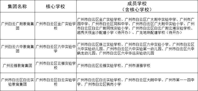 4个名校教育集团:广州白云广附教育集团、广州白云六中教育集团、广州云雅教育集团、广州市白云区白云实验教育集团。该类教育集团以优质名校为核心校,成员校以初中、小学为主,纳入部分幼儿园。加强与省市名校教育合作对接,发挥优质教育资源的辐射带动作用,带动“潜力”学校共同发展。