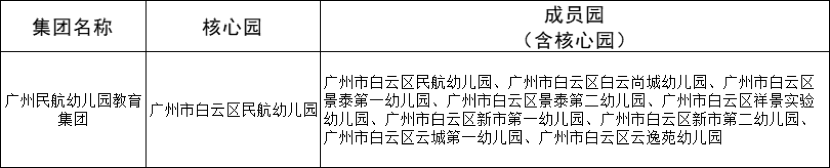 1个幼儿园教育集团:广州民航幼儿园教育集团,该类教育集团以优质幼儿园为核心园,纳入若干幼儿园为成员园。