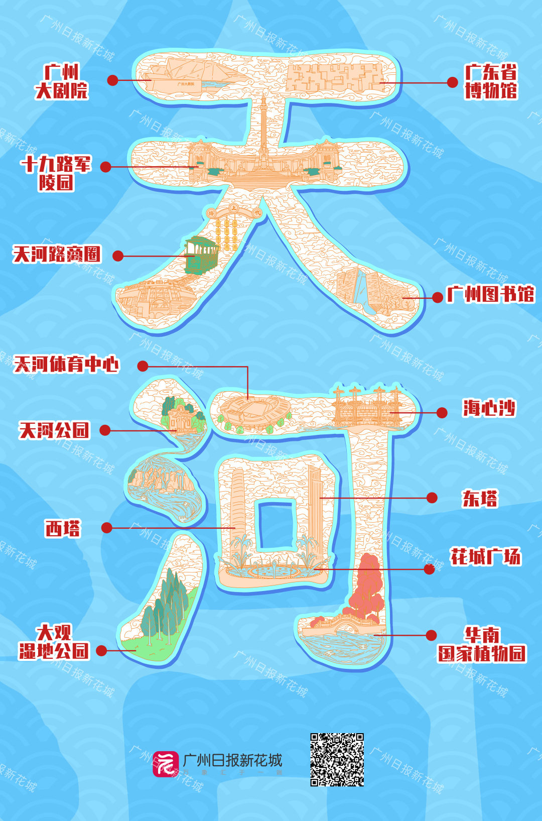 字绘版广州“文旅地图”通过别出心裁的“汉字画”,将广州11区的特色景点浓缩其中,实现“一图读懂一个区、一图游玩一个区”,进而为广大市民、游客提供广州11区生动有趣的游玩指引。