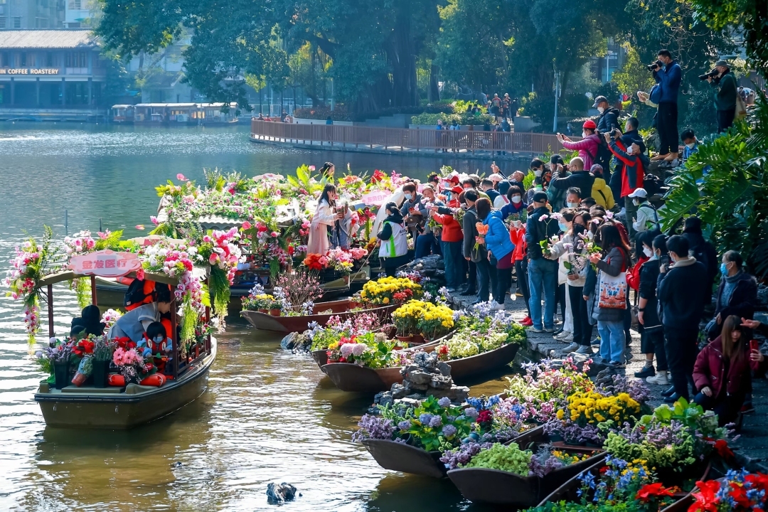 水上花市作为历经百年、全国唯一的花市活动品牌,届时身穿节日盛装的“西关小姐”将乘着十二艘结合岭南花卉、广府文化和龙年主题的特色花船在荔湾湖上巡游,多位粤剧曲艺名家、知名书画家、名嘴主持登台献艺,“梅花(奖)牡丹(奖)”竞芳菲,隆重推出水上花市主题Citywalk线路,举办“龙腾盛世兰香湾区”主题花市推介活动,为市民游客呈现花市、花船、粤韵、民俗共同交织的热烈春景。