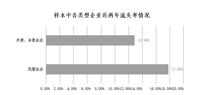 从企业投资主体看,外资、合资企业的员工流失率普遍低于民营企业。据悉,抽样调查企业中共有17家外资企业、12家合资企业填报了问卷,近两年员工年均流失率为12.9%,明显低于民营企业17.8%的流失率,部分外资企业甚至控制在5%以内。“外资、合资企业的薪酬福利体系较为完善、管理相对规范,员工招录门槛也相对较高,有利于保持员工稳定性,降低流失率。”调研报告称。