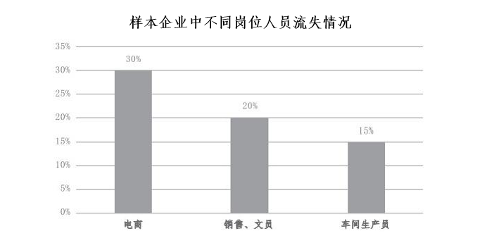 从岗位类型看,电商、销售、文员等岗位的流动性高于车间一线生产员工。经对样本公司离职人员进行画像分析,并结合受访企业反馈情况,电商岗位的年均流失率在30%以上;销售、文员等岗位的年均流失率在20%以上,而车间一线生产员工的年均流失率总体在15%左右。