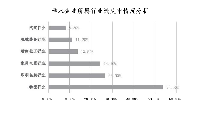 从行业类型看,汽配行业员工稳定性最好,物流行业员工流动性最大。据悉,在样本企业中,年平均员工流失率最低的行业为汽配行业,保持在8.2%左右,其余行业员工年平均流失率依次为:机械装备行业11.2%、精细化工行业13.8%、家用电器行业24.4%、印刷包装行业26.5%、物流行业53.6%。