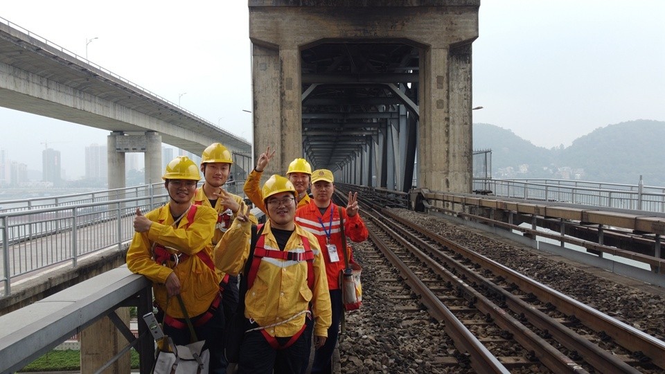 手摇车只有两端与铁路桥底部连接,需手摇两侧的传动齿轮驱动前行。江面横风吹来,手摇车晃晃悠悠,两端齿轮发出“咯吱咯吱”声,脚下十几米江水奔腾,不一会寒风就吹红了大家的脸颊和耳朵。大家顾不上揉搓,继续一手拿着工具,一手扶着栏杆,眼观、耳听、手摸……检查桥梁支座时,大家需手脚并用爬进距离江面近20米高的墩台缝隙中。