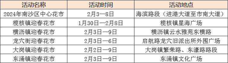 2月3日至8日,2024年南沙区中心花市将在海滨路段(进港大道至市南大道)举办。