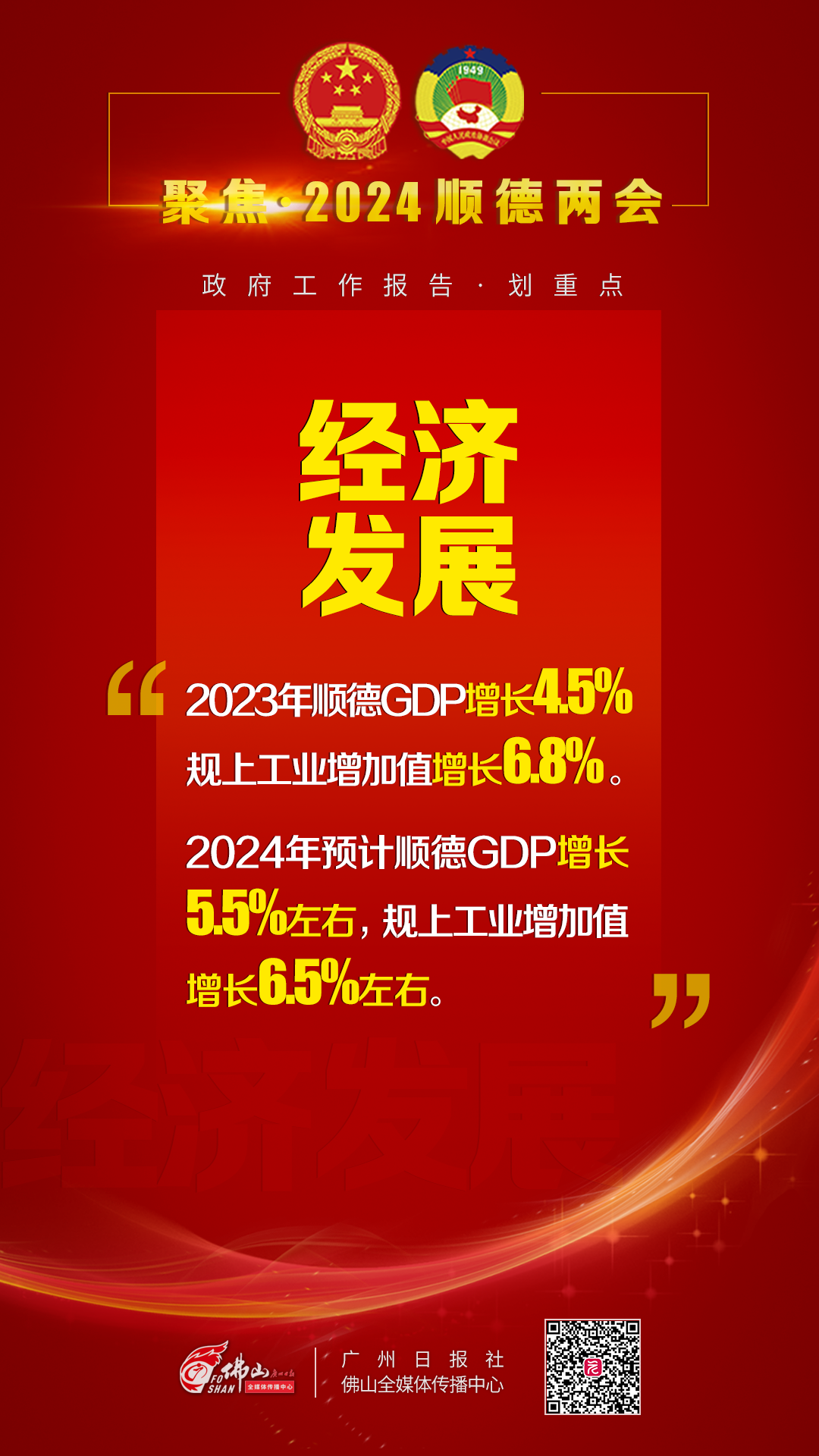 《报告》显示,今年顺德经济社会发展的主要预期目标是:地区生产总值增长5.5%左右,规上工业增加值增长6.5%左右,居民人均可支配收入增长与经济增长基本同步。