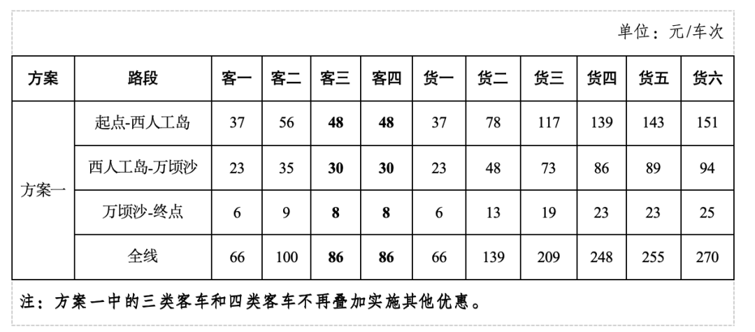 听证方案一:项目全线车辆通行费收费标准为66元/标准车次,执行全省高速公路统一的车型分类方式和收费系数;其中,三类客车、四类客车收费系数按现行系数的65%执行,收费标准均为86元/车次。
