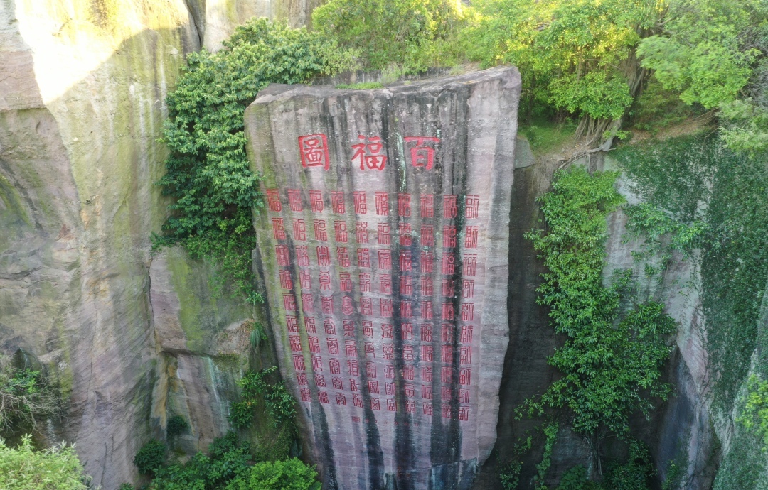 穿越古采石场,置身百福摹崖。一笔一画皆祝愿,百福宏图福绵延。101个形态各异的“福”字,由书法家黄绍文手书,字形飘逸俊秀,寓意百福具臻,是众多游客祈福打卡的网红景点。