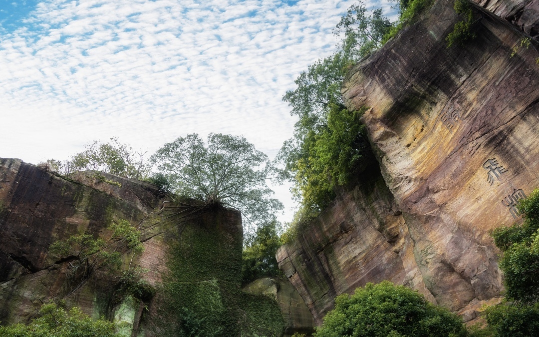 巨石斑驳,是先民世代雕琢,是岁月亘古侵蚀,飞榕破壁,是生命伟力璀璨盛放,是天地灵秀不可阻挡。绝壁之上,飞榕凌空挺立,红砂厚重,绿榕鲜活,自成一方奇景。
