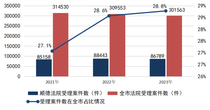 在刚刚过去的2023年,顺德法院坚持为大局服务、为人民司法,忠实履行宪法法律职责,为顺德高质量发展提供坚实司法服务和保障。数据显示,全年共受理案件86789件,结案76774件,均位列全市法院首位;法官人均结案427件,创历史新高;通过非诉途径化解纠纷28292件,诉源治理取得实效。