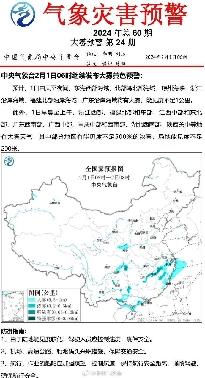 中央气象台2月1日06时继续发布大雾黄色预警↓