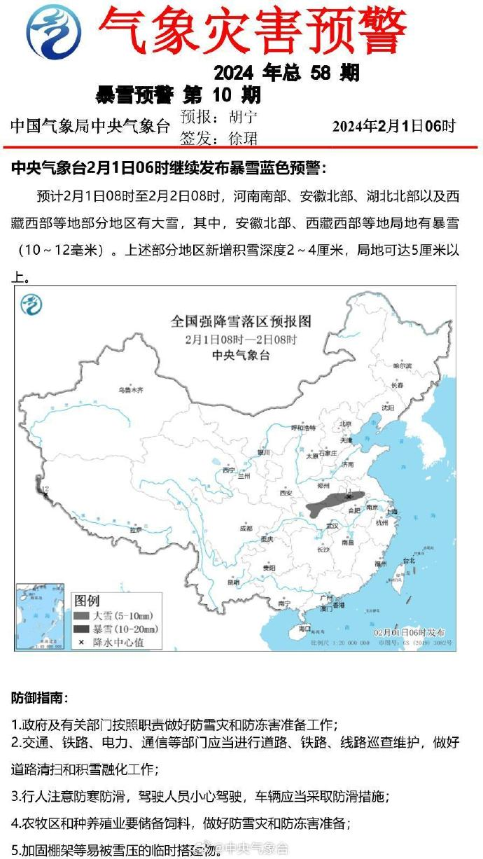 中央气象台2月1日06时继续发布暴雪蓝色预警↓