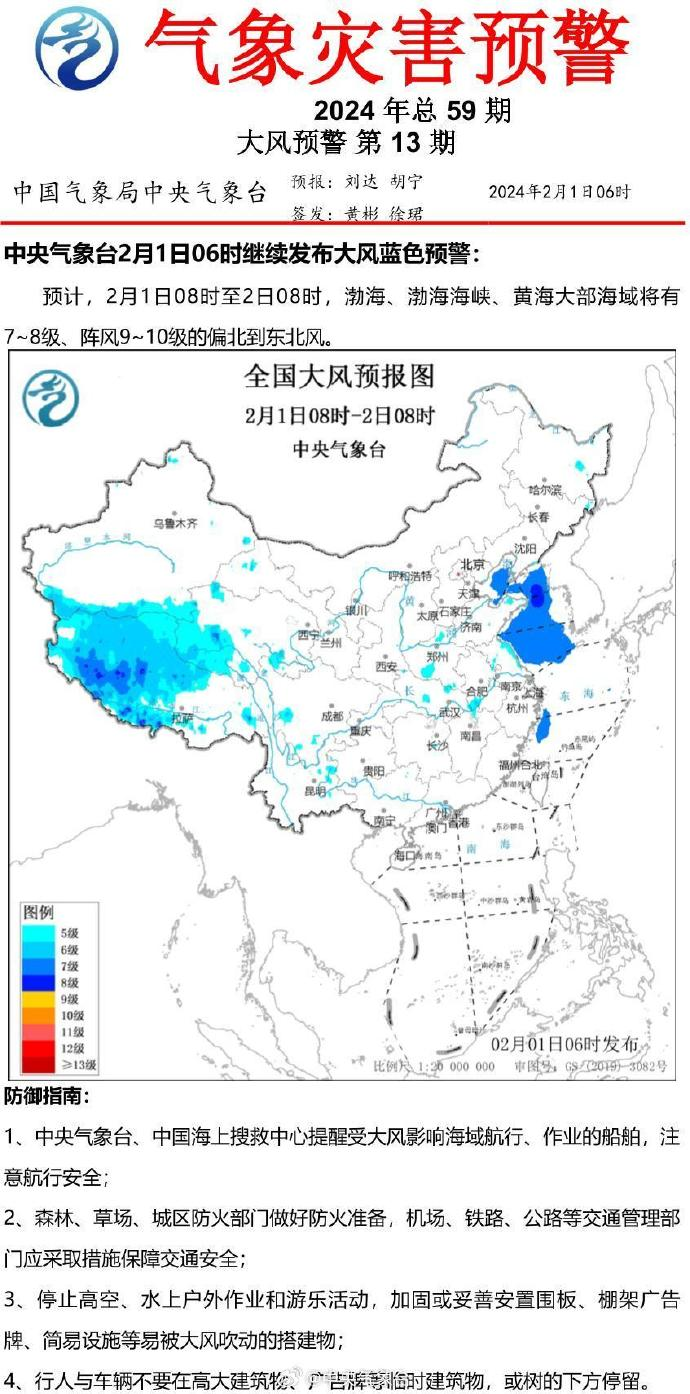 中央气象台2月1日06时继续发布大风蓝色预警↓