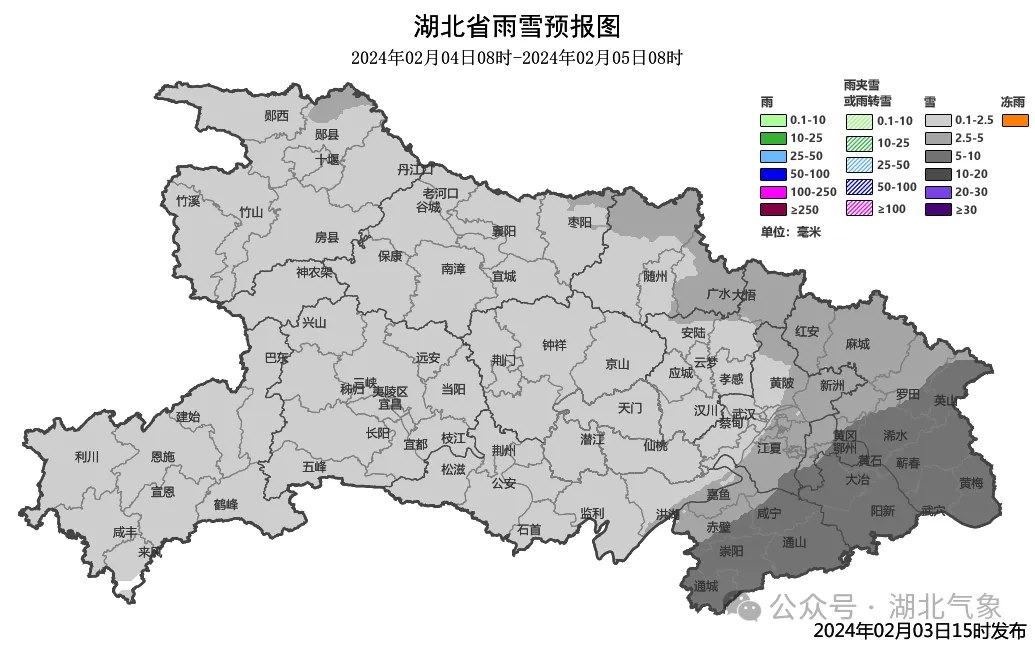 记者从湖北省气象局获悉,武汉中心气象台2月3日19时继续发布低温雨雪冰冻橙色预警:2月1日至3日白天,十堰、襄阳、神农架、宜昌、荆门、荆州西部、随州、孝感、天门、潜江、仙桃、武汉北部、黄冈西部已出现积雪,恩施、荆州东部、武汉南部、黄冈东部、咸宁、鄂州、黄石出现冻雨或冰粒,预计3日20时至4日20时,全省将出现降雪,最低气温≤-2℃,请注意防范。