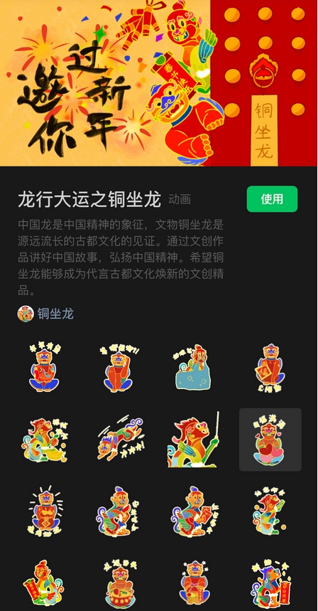 项目负责人、印刷学院设计艺术学院党委书记史民峰透露,围绕龙形文物,该校师生正在设计日常化的表情包,涉及问安、好的、收到、感谢等日常用语,让铜坐龙表情包不仅仅是龙年春节的限定作品。