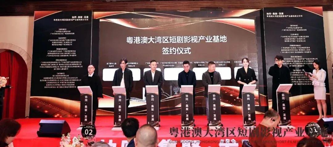 活动现场,在参加活动的各职能部门、影视企业、导演、制片和演员的见证下,粤港澳大湾区短剧影视产业基地正式成立,并举行基地联合发起单位签约仪式。