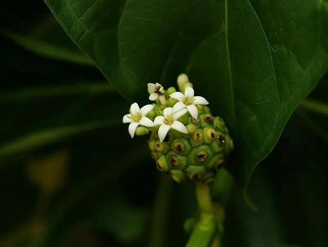 海滨木巴戟的果实可谓是“臭名昭著”的诺丽果,味道如奶制品发酵,吃下去能让好多人吐出来,所以别称也叫“呕吐果”。诺丽果的果子并不是一个“果实”,而是由一堆果实聚合在一起的一个果序特化而成的,植物学上叫“聚花核果浆果状”。因为花期实在太漫长,下面的花败了开始结果了,上面的花才刚开,因此叫“先结果后开花”。