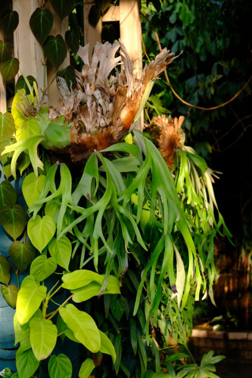 鹿角蕨的外形壮观且非常特殊,像鹿角一样分叉伸长,近来被广泛用作美化绿化庭院的重要角色之一。鹿角蕨一般生长在树的结疤处或者树丫处,就好像给树穿了一身衣服一样,所以当地人有人称鹿角蕨是树的衣服。