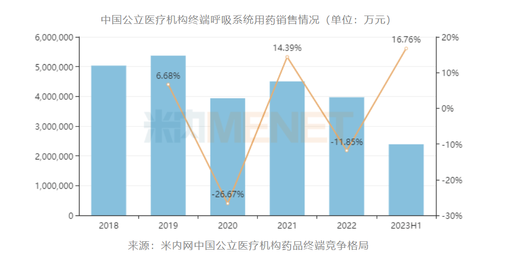 呼吸系统用药销售额持续攀升。米内网数据显示,呼吸系统用药此前在中国城市公立医院、县级公立医院、城市社区中心及乡镇卫生院(简称中国公立医疗机构)终端销售额持续攀升,从2013年的超过260亿元增长至2019年的接近540亿元;随后进入调整期,2020年、2022年分别大跌26.67%、11.85%,2022年销售额接近400亿元;2023年上半年大幅增长16.76%,市场接近240亿元。