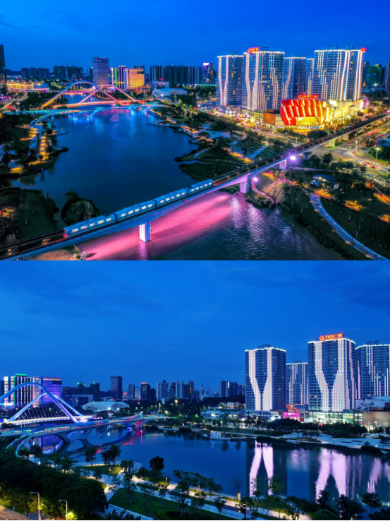 夜幕降临,花市周边目光可及的蕉门河双桥、聚星桥、创享湾、南沙国际人才港、南沙星河COCO Park、南沙万达等各大地标灯光亮起,为游客朋友展现南沙街道流光溢彩的另一面。本次南沙花市的牌楼、摊档均安装了灯光设备,海滨路两旁也安装了灯条与大红灯笼,打造花市“不夜城”。同时,南沙花市还准备了“花市大舞台”,为游客朋友带来夜场大秀。