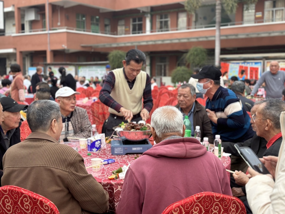 上午11时20分左右,伴随着社工站“五社联动聚合力,社工服务护耆安”情景剧的演出,现场三十五围盆菜端上餐桌,包括130多名困难群众在内的近350人开吃特色大盆菜。