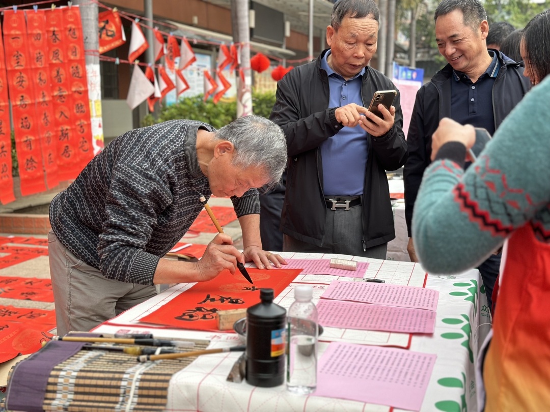 在视力筛查摊位的对面,“大红福字请进了千家万户中”活动热闹不已。书法爱好者卓叔正忙着写春联,一旁的村民正在挑选中意的词句,交给卓叔现场挥毫。“上午九点半到现在,写了几十副对联。书法是我的爱好,快过年了,能给大家写写春联挺有意义的。”卓叔介绍道,自己是水电二局的退休职工,练习书法已经近十年。据了解,卓叔和来自新塘镇书画协会的2位老师,共准备了100多副春联现场免费派送。