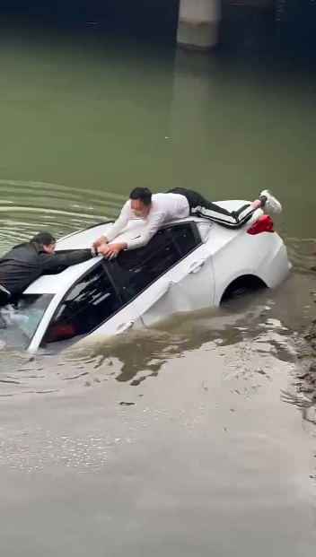 所幸的是,有路过的街坊看到这一情况,紧急“出手”相救。其中一白衣男子勇敢跳下河涌,从河涌淤泥一岸爬上这辆被水淹了一半的轿车,逐一将车内两人平安拉出来。据网友提供的视频,救人现场十分紧张,由于车身表面光滑,爬出来的被困男子还差一点摔入河内。