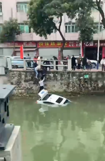 一小车因躲避一辆三轮车,不慎冲下路边河涌,一时间半辆车被淹没河涌里,还有两人被困车中,在这危急万分时刻,路过的街坊跳下河涌“出手”相救,最终成功救出被困车内的人员。这是1月28日发生在佛山市顺德区勒流街道的一幕。