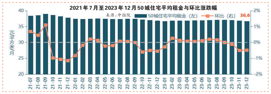 从市场情况来看,2023年以来租赁市场确实出现稳中有跌的行情,尤其年末淡季租金有所回调。根据中指院最新发布的50城住宅租赁价格指数,2023年,全国重点50城住宅平均租金累计下跌0.30%,跌幅较2022年收窄2.20个百分点。不过各城市租金表现有所分化,广州等城市涨幅在1.0%以内。2023年一线城市住宅平均租金累计上涨0.89%,租金呈平稳回升状态。