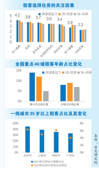 从需求来看,根据贝壳研究院测算,2023年我国租赁人口达到约2.6亿人,住房租赁市场交易总额保持增长,超过2万亿元。租客选择住房关注哪些因素?数据显示,对于青年租客而言,除通勤和地段外,28岁以内青年租客更加重视的是居住品质和周边环境。从租赁类型来看,95后青年租客选择带有一定服务的机构化房源的比例为22.2%,特别是选择集中式公寓的比例较高,很多新青年在选择住房时,在支付能力允许的情况下,更愿意租住提供品质化房屋和专业化服务的机构化房源。