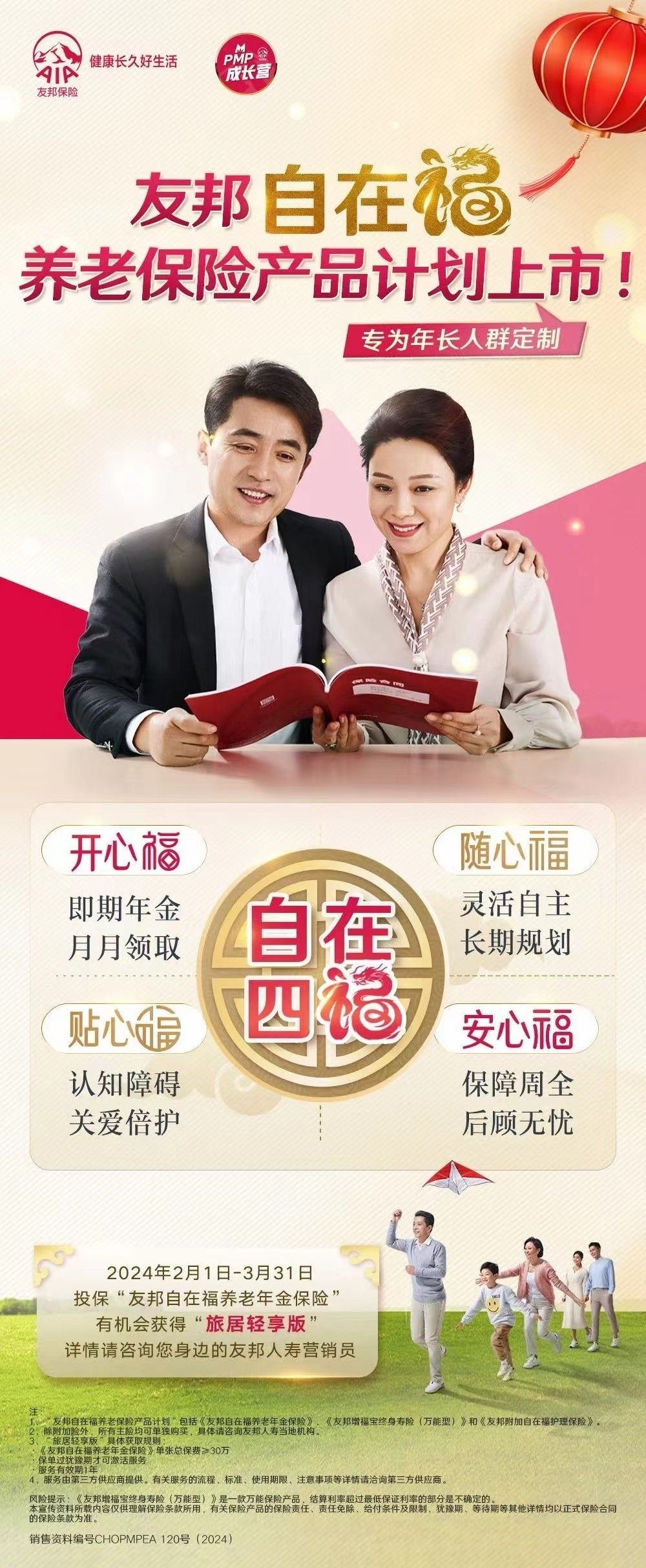 基于以上对“银发族”在养老资金、护理以及资源需求的深刻洞察,友邦人寿秉持“客户驱动的业务革新”,全新推出“自在福”养老保险产品计划,充分发挥保险产品相比于其他金融产品的优势,基于保险产品长期性以及风险管理的本质,不仅在财富端为年长人群提供最快可即期给付的稳定的现金流和长期护理资金,更协同其不断升级的“养老生态圈”,为客户提供“资金+资源”的养老整体规划。无论是子女为父母购买,还是老人为自己购买,客户都将收获财富、健康和服务三重支持,享受“今日即刻规划,明日自在享老”的品质养老生活。