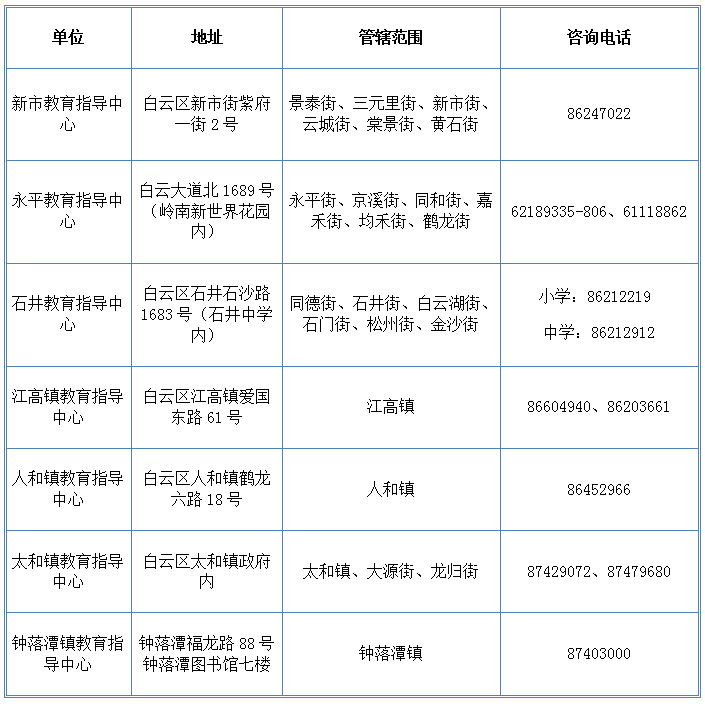(二)永平教育指导中心:广州市白云区京溪小学、广州市白云区同和小学、广州市白云区握山小学、广州市白云区永泰小学、广州市白云区华师附中实验小学、广州市白云区云英实验学校(小学部)、广州市白云区广大附中实验小学(含非起始年级)、广州市白云区黄边小学。