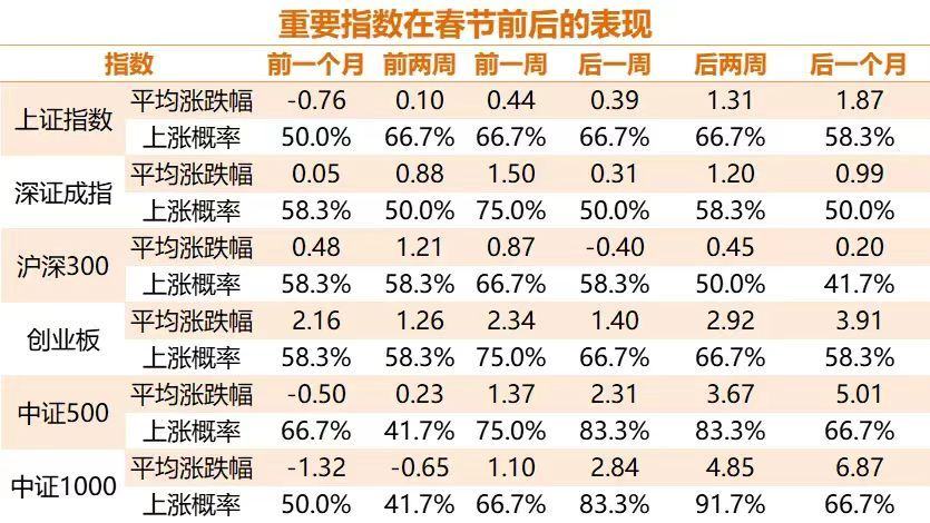 从历史数据来看,A股在春节前后或迎“春节躁动”。光大证券梳理2012年~2023年春节前后市场表现,发现春节前市场面临一定的压力,春节后市场回暖趋势明显。具体来看,春节前1个月或两周,市场上涨概率一般不超60%,部分指数平均涨跌幅甚至为负值,而且小盘股表现要弱于大盘股;临近春节一周,市场的表现更加强势,上涨概率普遍超过65%,且创业板指、中证500、中证1000的平均涨幅均超1%。春节后市场表现明显更加强势,特别是创业板指、中证500、中证1000等中小市值指数,上涨概率基本均超60%;而大市值个股表现较弱,沪深300节后一个月上涨概率甚至不足42%。