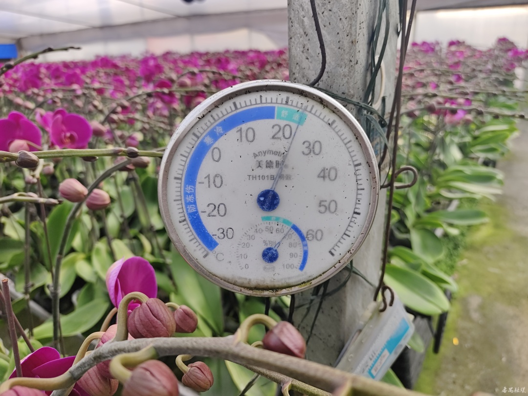 “一棵蝴蝶兰的幼苗需要经历两年的生长,才能迎来属于自己的花期,其间,需要进行育苗、换盆、查苗、去虫害、吹花等,而且蝴蝶兰对温度、施肥量、浇水量等都十分讲究,哪个环节出了问题,蝴蝶兰就无法绽放。”据王常伟介绍,基地今年春节除了7万株蝴蝶兰上市,还有20多万苗株的还处于成长期。为了确保蝴蝶兰常年有适宜的生长环境,目前种植的大棚就有五层保温膜,还在苗床上方的钢架上装载的风机系统,加上多台不停运转,控制着棚内的温湿度,以精准调控蝴蝶兰开花时间。“我们这个大棚里有7台空调,要保持温度在16℃—26℃左右,确保蝴蝶兰有适宜的生长环境。”王常伟说。
