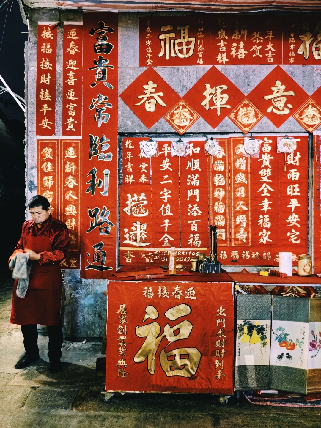 今年,由于快子路沿线升级改造,许多挥春摊档设在了与其相接的锦华路上。市民还没有进入快子路,就能在锦华路上看到“一红到底”的挥春景象。去年12月,挥春人早早来到这里摆摊挥春,为从四面八方赶来的市民挥写新年愿望与美好祝福。老旧的房子,狭长的街巷,吸睛的红艳,百米挥春街满载着佛山人的“独家记忆”。