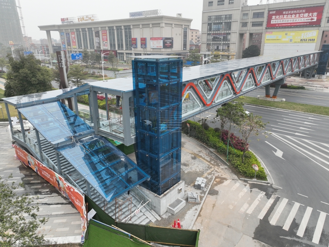 该工程位于佛山市禅城区南庄镇季华西路与禅秀路交叉口东侧,施工内容为新建一座长99.8米,宽5.5m的人行天桥。项目主体已基本完工,达到通行条件。其中两座垂直电梯正在调试中,暂未开放。