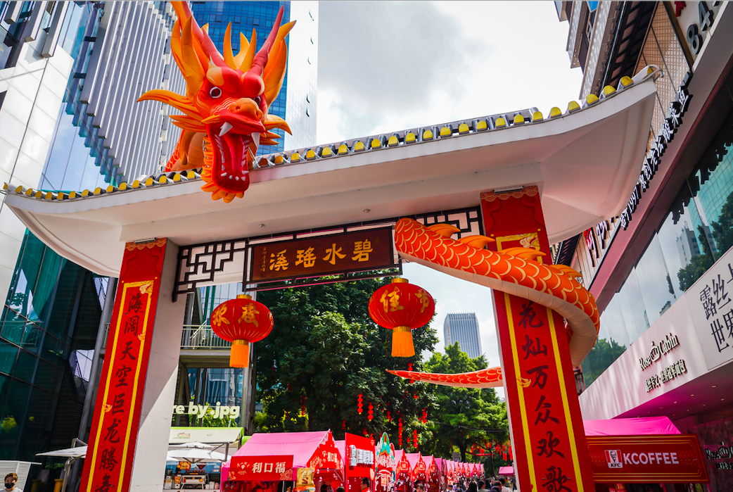 在花市的入口,一条龙飞跃在碧水瑶溪牌坊上,大红灯笼高高挂起,牌坊两边张贴了醒目的对联,喜庆的装置吸引了不少市民驻足拍照。