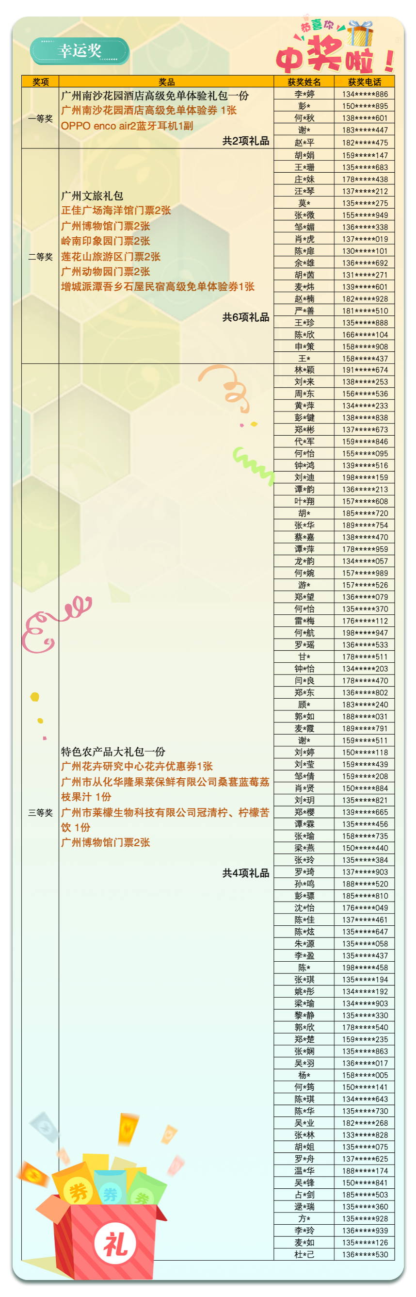 各位获奖的幸运朋友,快来领取你的专属大礼包!广州南沙花园酒店高级免单体验、广州文旅大礼包、特色农产品礼包,还有移动/联通/电信手机流量包等专属福利等你带回家!