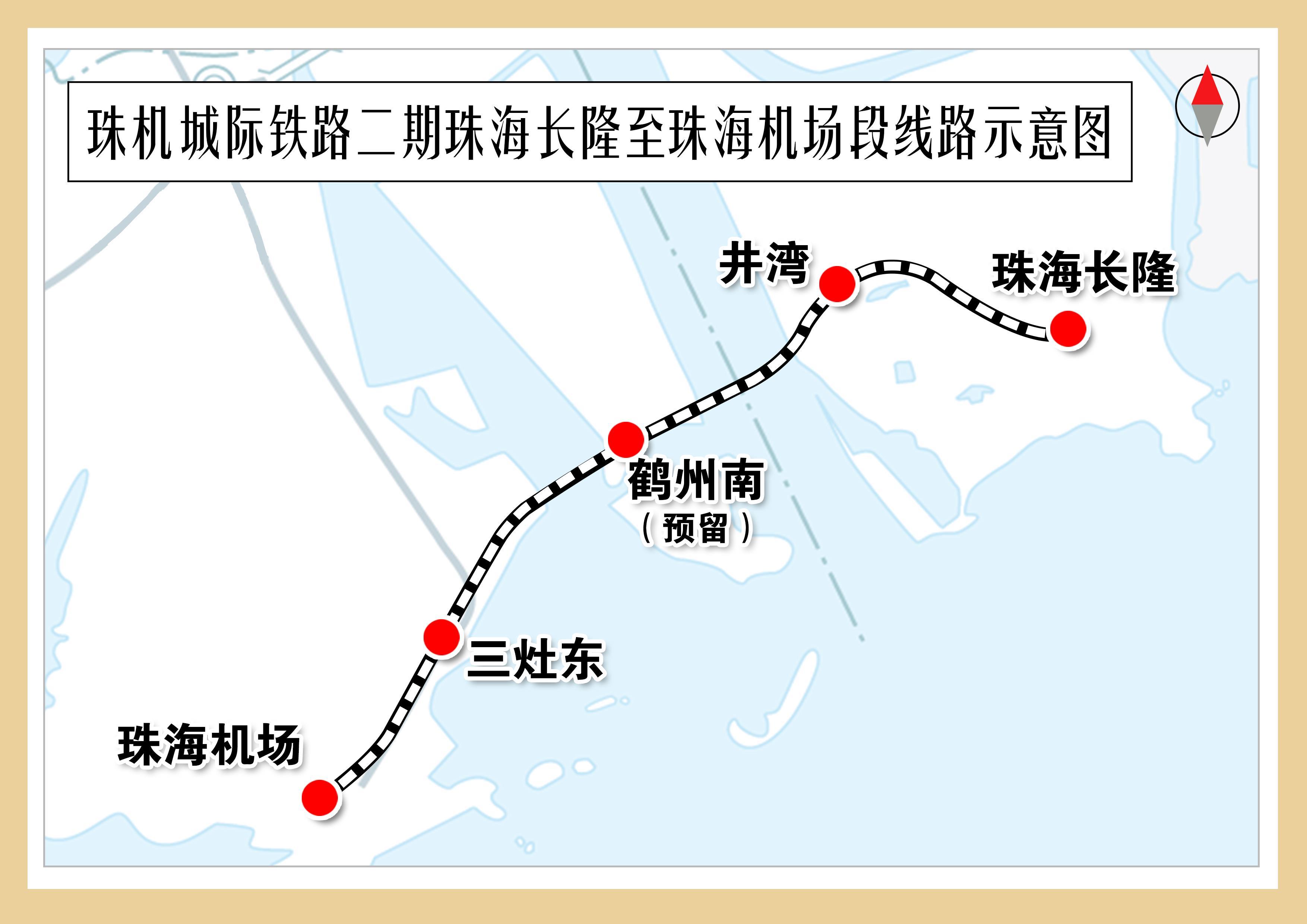 珠机城际铁路二期由珠海长隆站向西延伸,穿过大横琴山,依次跨过磨刀门水道、白藤河水道,抵达金湾三灶镇后接入珠海机场综合交通枢纽,抵达珠海机场站。新建正线长22.8公里,为双线电气化铁路,设计时速160公里。全线设4个车站,分别为井湾站、鹤洲南站、三灶东站、珠海机场站,其中鹤州南站为高架预留站,珠海机场站为地下站。珠机城际铁路二期自2018年起开工建设。