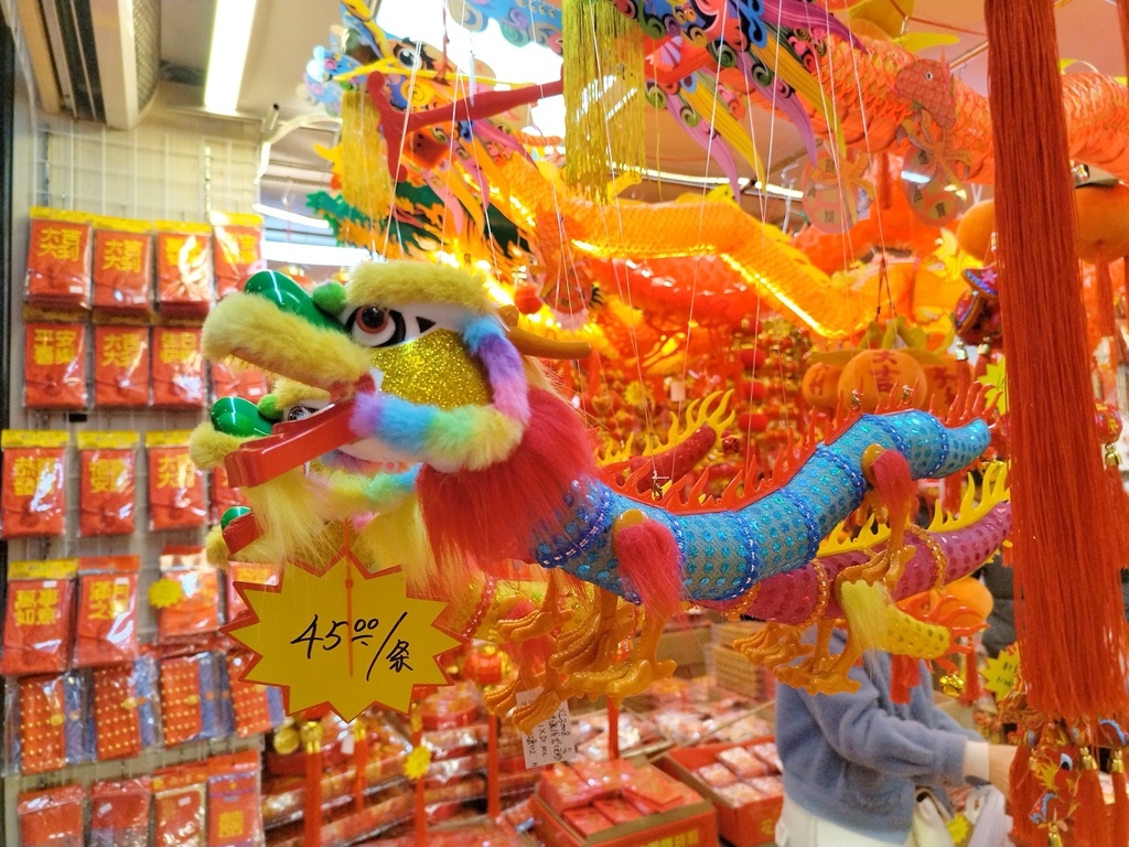 “对联怎么卖?”“有没有尺寸大点的摆件?”一德路上,问询和售卖声此起彼伏,商家们将灯笼、春联、利是封、窗花、中国结、门贴等春节用品摆放出来,目之所及一片红色。甲辰龙年,“龙”自然成为今年装饰用品的主角,不少产品都融入龙元素,如龙摆件、龙窗花、龙对联等,憨态可掬的造型惹人喜爱,活灵活现的设计寓意吉祥。