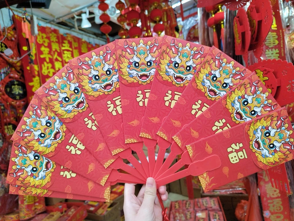 “哇,这红包一打开就是扇子的形状。”在一家店铺前,一名顾客手里拿着一款扇子形状的利是封。每根扇柄上都粘贴一个红包,10~12个红包为一组,组成一把扇子,再系上中国结流苏作为点缀,一款扇子利是封就产生了。记者走访一德路市场,绝大多数店铺都在售卖这款产品,龙造型款、卡通动漫款等应有尽有,价格从15元到20元不等。有店家表示,这款红包数量多、有排面,特别适合送给父母、长辈。