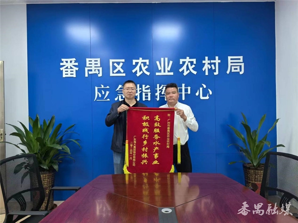 2月1日,广东海大集团项目管理副总监孙明华博士向番禺区农业农村局赠送锦旗,锦旗上的内容为“高效服务水产事业,积极践行乡村振兴”,孙明华表示,这是为了感谢番禺区农业农村局长期以来给予海大集团的支持与帮助。