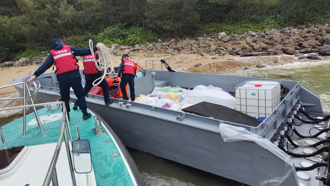 在海警执法艇约10分钟的全速追缉后,该摩托艇在下川岛强行冲滩,3名嫌疑人弃船往槟榔湾逃窜。执法员立即将嫌疑人情况通报至当地公安部门协助查缉,随后对该船进行登临检查。