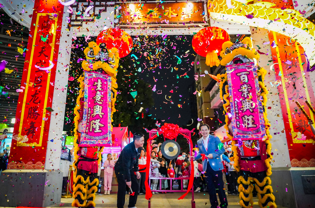 “铛!”随着敲锣声响起,海珠区花市江南东分会场正式开市。造型大气的花市门楼、威武的中国龙模型、亮眼的灯画装饰、琳琅满目的年货和种类多样的年花……整个花市年味浓厚。