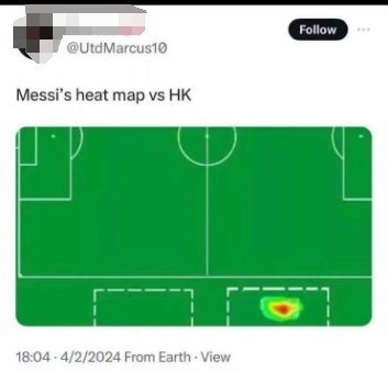 在社交媒体上,有人发自制的梅西在对阵香港明星队时的热度图,调侃他没有上场。↓