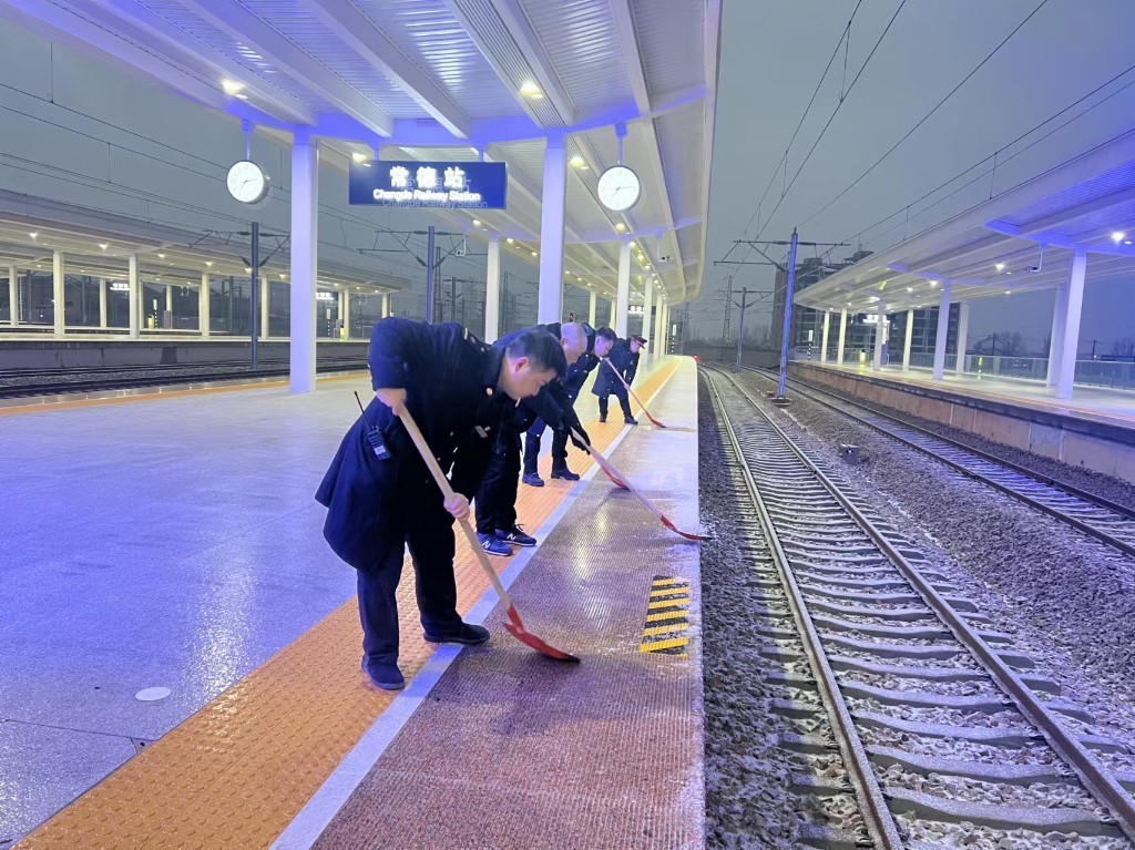 车站售票厅、进出站口、安检口等关键处所做好出行引导咨询和重点旅客的帮扶工作,在旅客乘降通道铺设防滑草垫,及时清理候露天阶梯、站台、广场的积雪、积水,防止旅客滑倒摔伤。