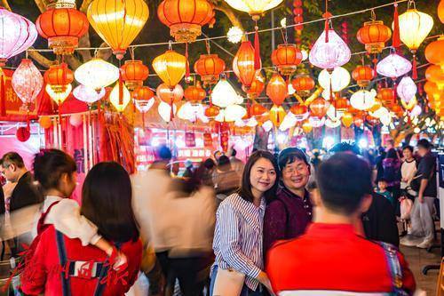 众多市民游客以多彩灯笼为背景拍照纪念幸福时刻